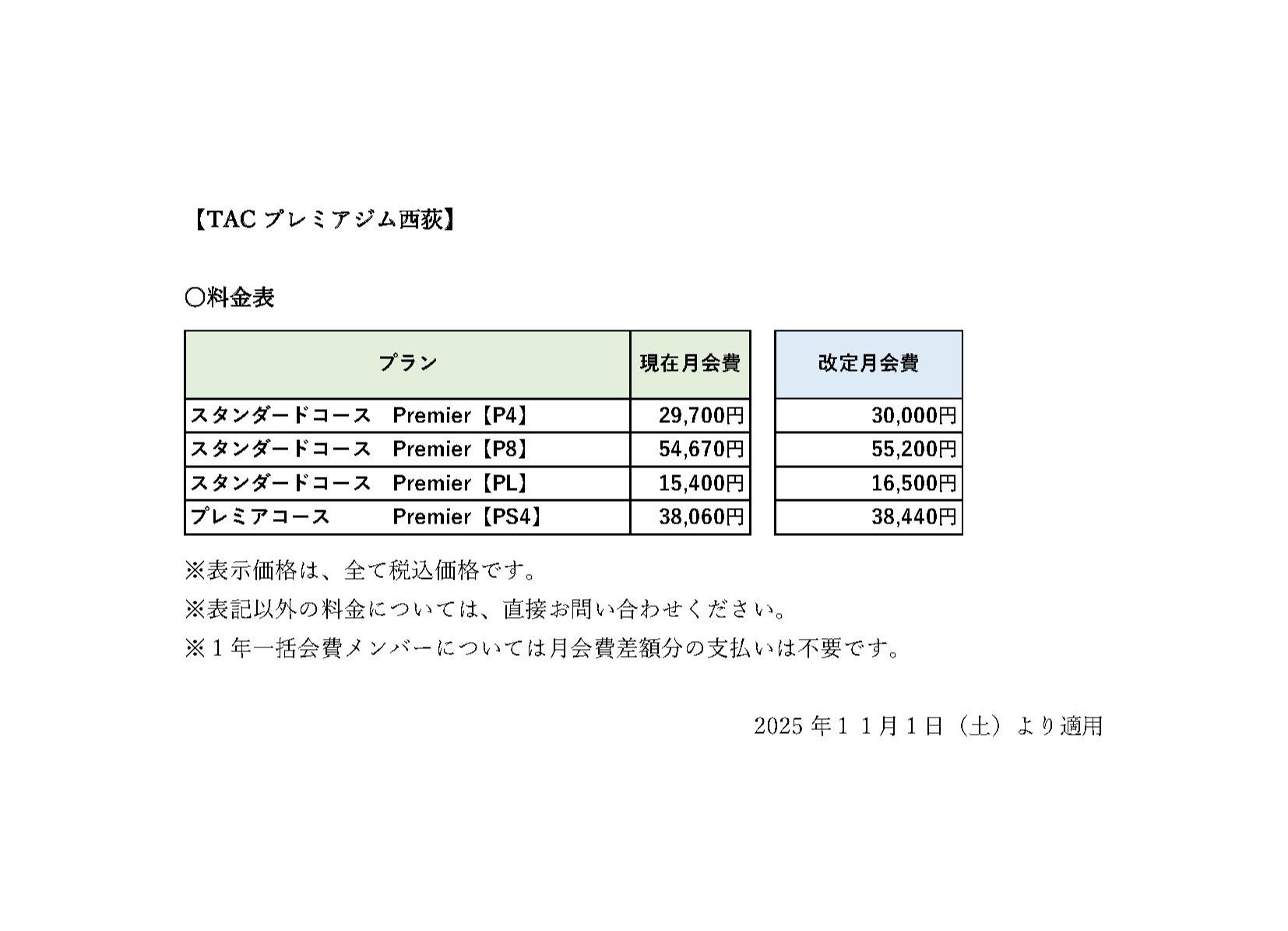 重要TACプレミアジム西荻 月会費改定のご案内
